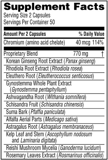 Other ingredients in this formula include nutrient-rich herbs like astragalus, reishi mushroom, suma, and ginkgo to fortify the nervous system. Alfalfa and kelp support the thyroid, and chromium and a fruit and vegetable base provide nutrients to nourish the body.