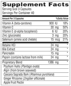 Bowel Detox contains pancreatin, a combination of pancreatic juices that aids in the digestion of a variety of foodstuffs. Additionally, pepsin aids in the digestion of dietary proteins. Bile salts are included to improve the digestion of fats. Psyllium, algin, and apple pectin are excellent sources of soluble fiber, which creates an increase in intestinal bulk, easing the movement of digested food through the intestines. Cascara sagrada helps to keep things moving by stimulating the movement of the intestines and increasing the content of water in the bowel. The end result is that toxins spend less time in the bowel, thereby reducing the time that they can affect intestinal cells or be absorbed into the body. Bowel Detox also contains bentonite, charcoal, and chlorophyll. As these ingredients bind to harmful chemicals and toxins in the body, they prevent the absorption of them, protecting the whole body, not just the bowels.