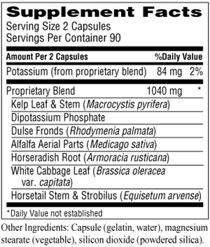 Potassium fulfills a long list of jobs in the body, including helping to regulate water balance (via the active transport pump), maintaining pH balance, maintaining blood pressure levels already within the normal range, and supporting neuromuscular function. Although there's plenty of potassium in many natural foods, commercial over-processing results in the loss of potassium and increases the sodium content. The ratio may be as high as 4:1 in favor of sodium. In addition, certain diseases and physical exertion can also deplete the body of potassium. Adequate potassium levels are essential for the body's active transport pump, which moves nutrients into cells. This herbal formula provides essential potassium from several rich, natural sources. Kosher certified.