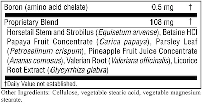 Skeletal Strength® provides essential nutrients that help increase the body's ability to support tissue and maintain cellular integrity. Calcium helps build bone strength, normalize muscle contraction, and regulate nerve function. Magnesium governs the proper utilization of calcium in joints, bones, muscles, and nerves. Boron, copper, and zinc help build and maintain strong bones and muscles. Iron and manganese are essential for calcium absorption and blood building. Vitamin A promotes the efficient use of calcium.